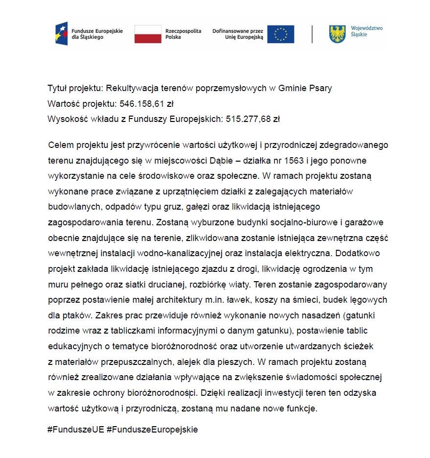 Miło nam poinformować, że w związku z uzyskanym dofinansowaniem na realizację projektu „Rekultywacja terenów poprzemysłowych w Gminie Psary” została podpisana umowa z wykonawcą robót – firmą General Development Sp. z o.o. z Tarnowskich Gór. Wartość podpisanego kontraktu wynosi 430.881,39 zł brutto.