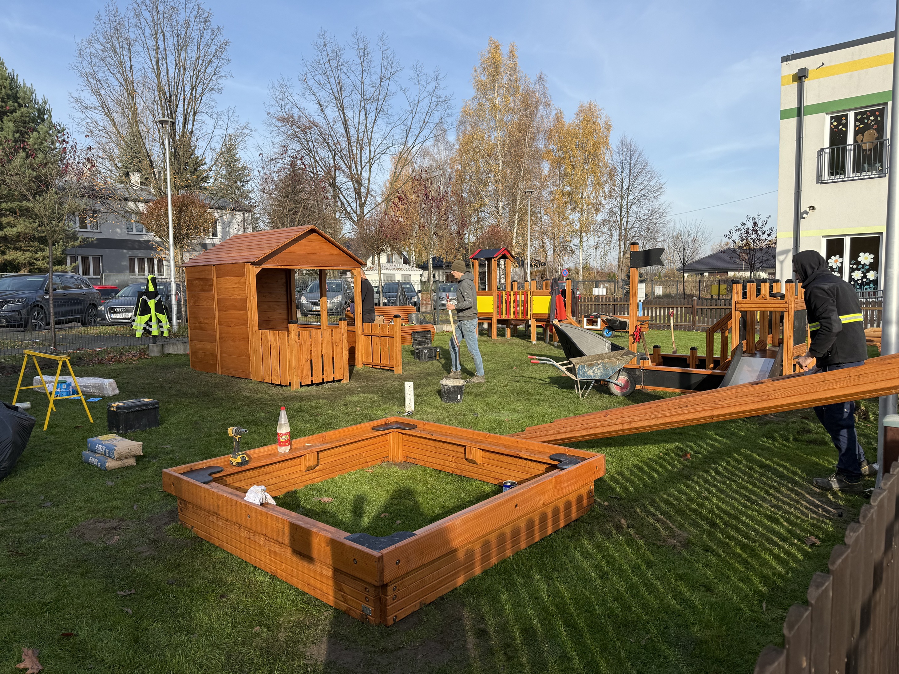 Nowy plac zabaw zostanie wyposażony w drewniane urządzenia utrzymane w stonowanej, naturalnej kolorystyce, w tym: drewniany domek z werandą, statek zabawowy, warownię, nową piaskownicę. Zaplanowano również montaż kuchni błotnej umożliwiającej zabawę wodą, piaskiem i naturalnymi materiałami, rozwijając wyobraźnię oraz poczucie sprawczości. W ramach inwestycji wykonane zostało przyłącze wody, niezbędne do funkcjonowania kuchni błotnej i zapewnienia dzieciom możliwości swobodnej i twórczej zabawy. Nad częścią placu pojawi się osłona cieniująca, zapewniająca ochronę przed słońcem w upalne dni, a drewniane ławki-sofy, dzięki swojej konstrukcji pozwolą na bezpieczne użytkowanie przez dzieci.