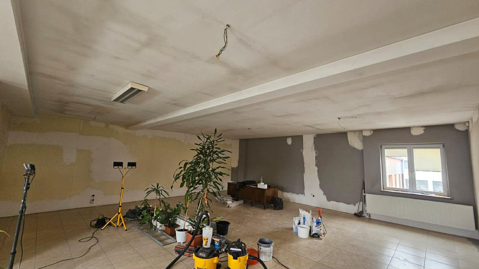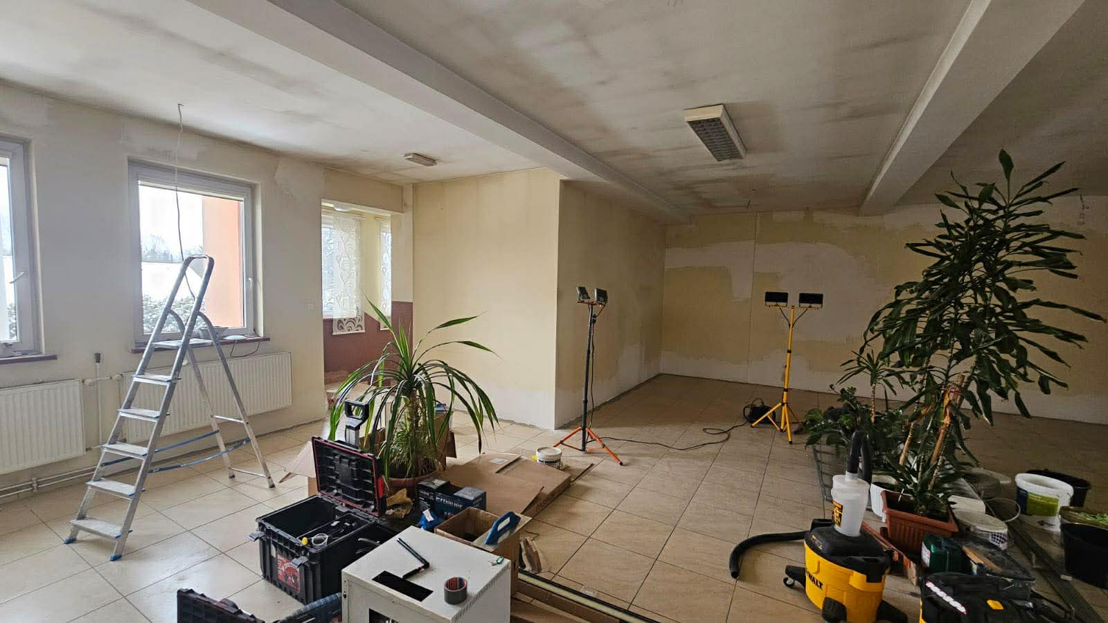 Zakres prac obejmuje kompleksową wymianę instalacji elektrycznej, montaż nowoczesnego oświetlenia oraz odświeżenie wnętrza — malowanie ścian i położenie wykładziny podłogowej. W oknach pojawią się estetyczne drewniane żaluzje, a przestrzeń zostanie wyposażona w ścianki ekspozycyjne umożliwiające prezentację obrazów i innych prac artystycznych.