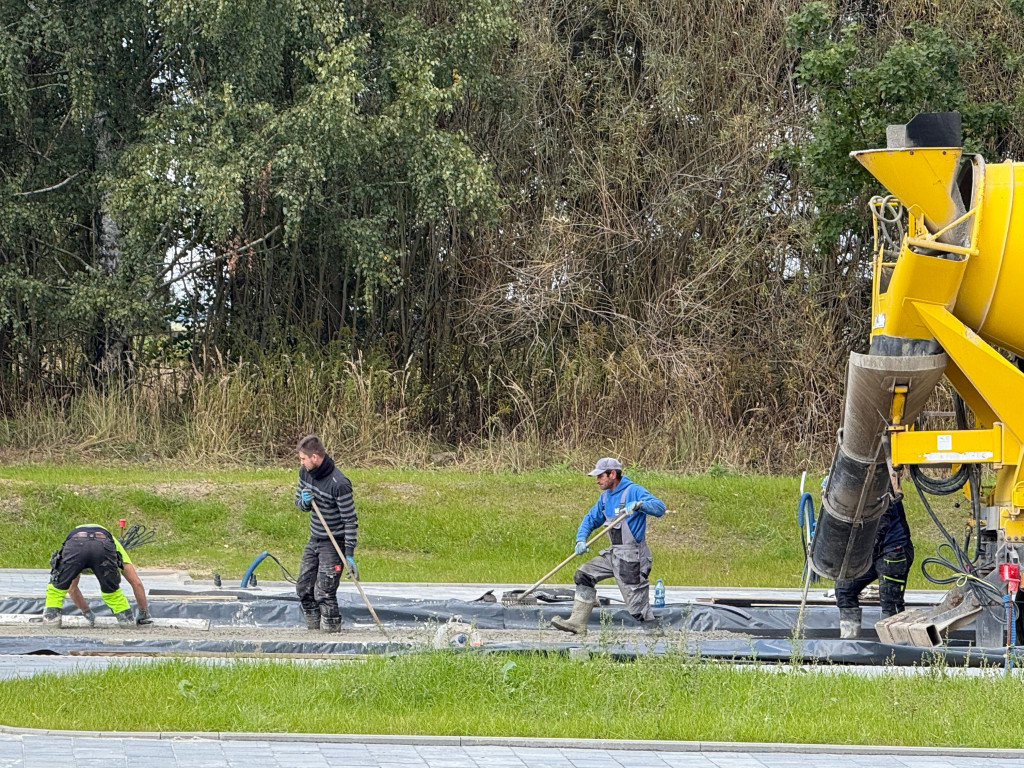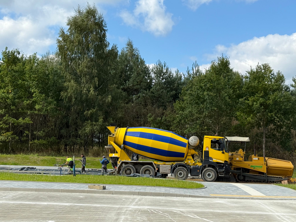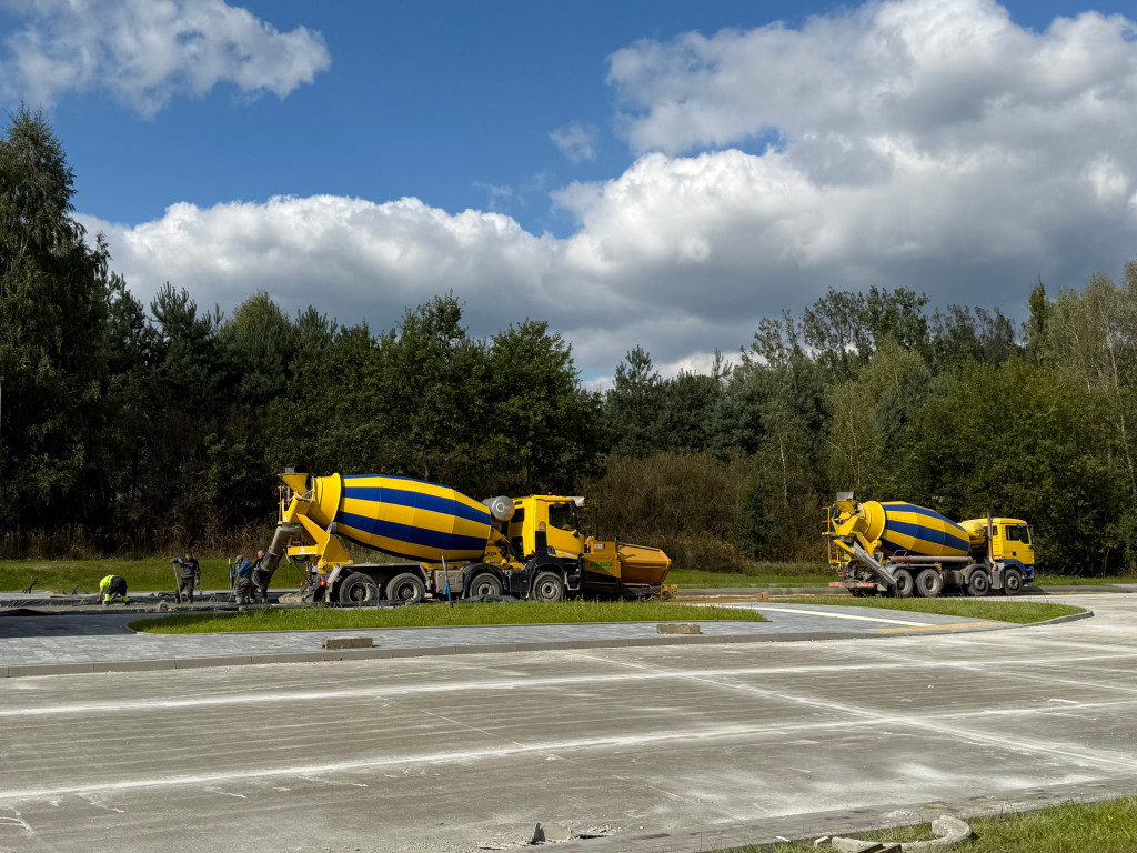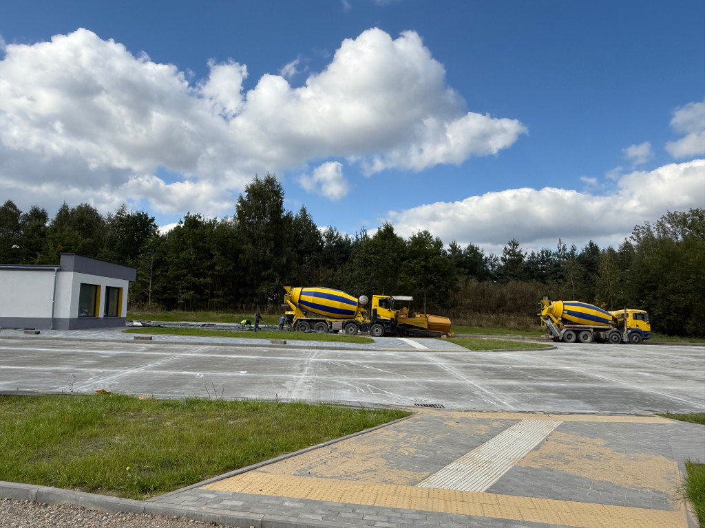 Nowy obiekt w Psarach nabiera już swojego docelowego kształtu – trwa układanie nawierzchni betonowej na miejscach postojowych dla autobusów, a wewnątrz poczekalni prowadzone są prace wykończeniowe.