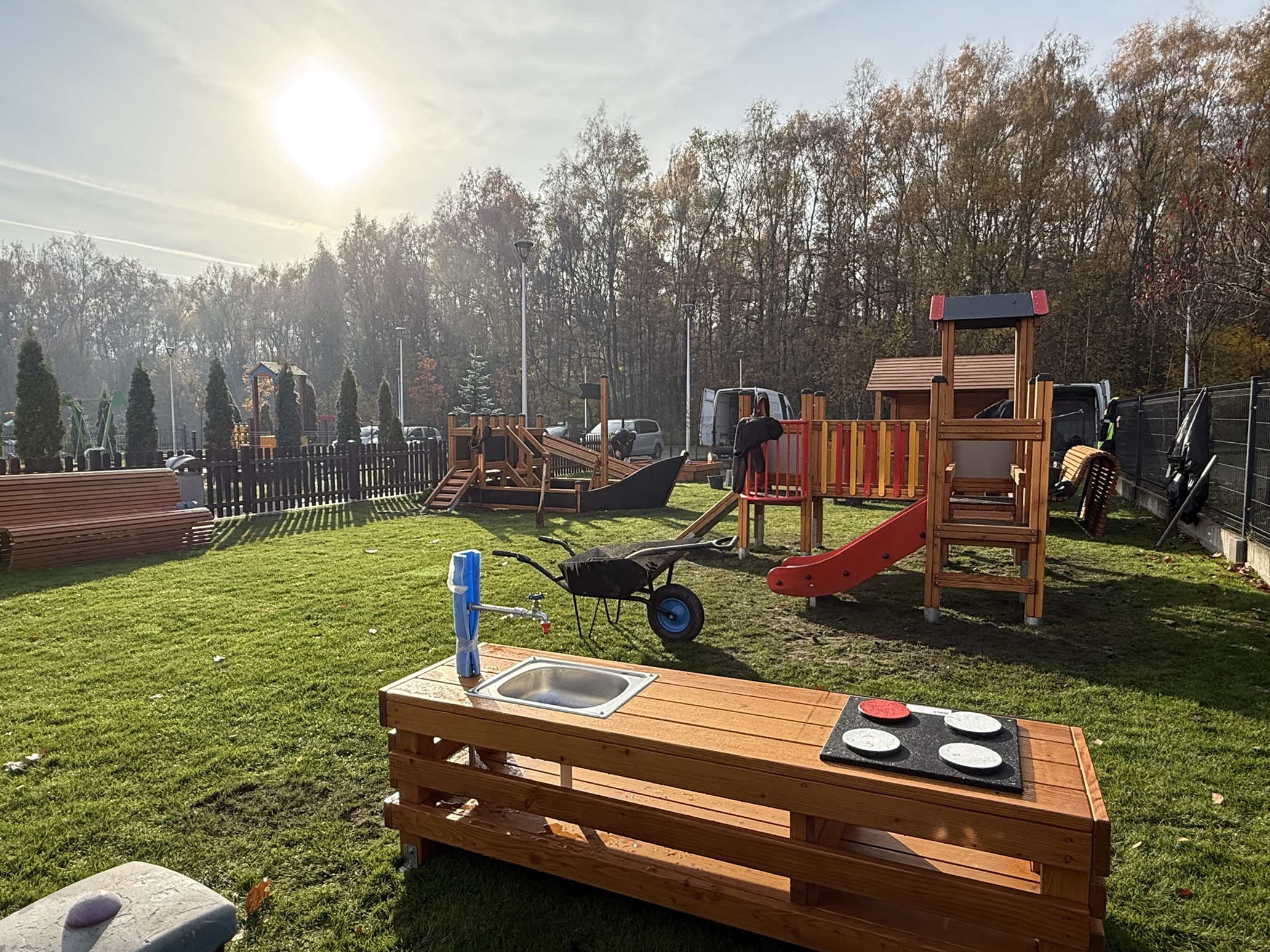 Nowy plac zabaw zostanie wyposażony w drewniane urządzenia utrzymane w stonowanej, naturalnej kolorystyce, w tym: drewniany domek z werandą, statek zabawowy, warownię, nową piaskownicę. Zaplanowano również montaż kuchni błotnej umożliwiającej zabawę wodą, piaskiem i naturalnymi materiałami, rozwijając wyobraźnię oraz poczucie sprawczości. W ramach inwestycji wykonane zostało przyłącze wody, niezbędne do funkcjonowania kuchni błotnej i zapewnienia dzieciom możliwości swobodnej i twórczej zabawy. Nad częścią placu pojawi się osłona cieniująca, zapewniająca ochronę przed słońcem w upalne dni, a drewniane ławki-sofy, dzięki swojej konstrukcji pozwolą na bezpieczne użytkowanie przez dzieci.